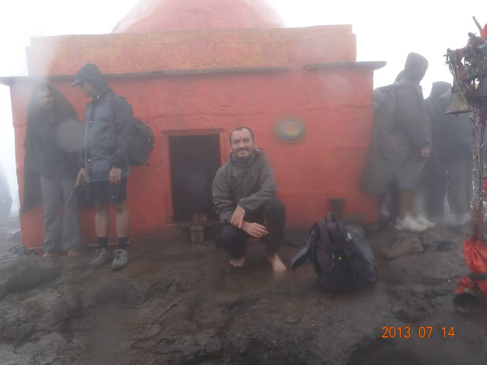 It was cloudy, it was chilly and to top it up it started raining heavily now !!!! Rain drops hitting us like someone was throwing small stones at you. At the peak there is small temple of Deity Kalsubai and I am sure view from the top would be amazing in non rainy season but all we could see was fog and fog around us.... We were literally standing in clouds. I was carrying incense stick and coconut offering which I offered at temple, small temple which didn't have space for more than 5people. Standing here it really gave first timer like me a sense of achievement and a feather in my trekking history of being able to summit this highest peak in Sahyadris. In meanwhile it was getting more and more cold as we stood at the peak, fingers getting numb, we were all shivering but the it was joy of reaching at the top and experiencing the moment of a lifetime that was holding us back...... Sheetal one of co trekker was literally in demand as she had carried "Bhakarwadi packet" all the way to the top and group members pounced to get a piece !!!!!! Moments to remember .......hahaha
